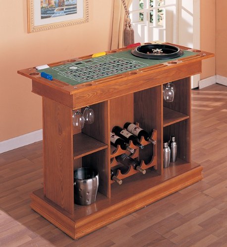 All in One Game Table/Bar Unit in Oak Finish Wood with Wine Rack/Shelves (Roulette, Blackjack and Craps. Brand new all purpose bar! This is a great addition to any home setting. Great for family fun and to serve and entertainment. Play roulette, blackjack or craps with this wonderful wood bar unit. It also comes with shelves, glass hangers and wine rack/shelf behind the unit. The table nicely converts to a solid wood top when not used or used to serve drinks. Fun and fashionable!. Specifications: Dimensions: 53 1/4"L x 24 1/4"W x 40 1/4"H. Materials: Hardwood and Veneers. Color: Brown. Pieces: 1. Finish: Oak