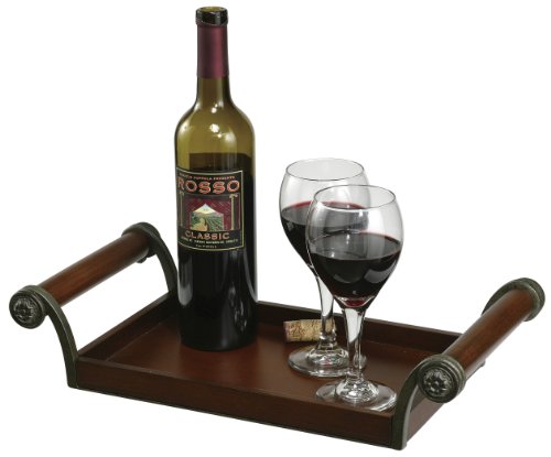 - The wrought iron metal wine rack is finished in warm gray and the wooden serving tray in Americana Cherry