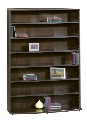 Six adjustable shelves. Holds 145 cardboard case VHS tapes, 96 oversized case VHS tapes, 280 DVDs or 426 CDs. Cinnamon Cherry finish.