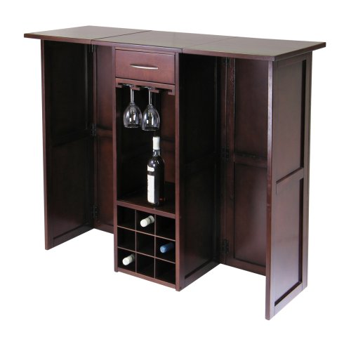 Our Newport Wine Bar with expandable top is made of solid/composite wood and finished in walnut color. It stores 9 bottles of wine, has a shelf with stemware holder, an accessory drawer with satin finish pull. When extra space is needed, there are two folding drop leaves.