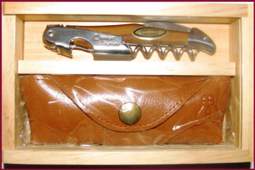 - Set includes leather pouch and natural wood presentation box Imitation ollive wood handle Stainless steel bolsters 5-turn spiral Micro-serated blade Bottle-cap opener